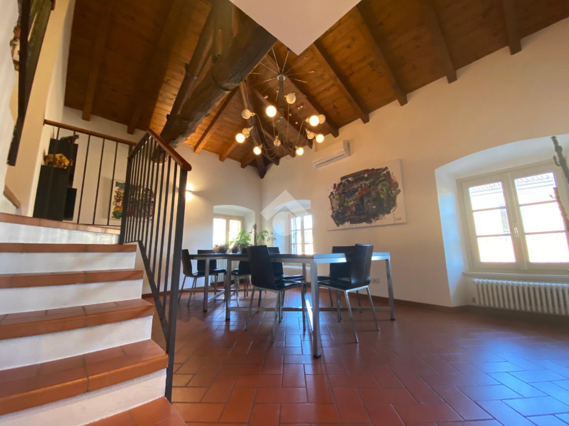 L’ingresso introduce a un raffinato salone di rappresentanza, impreziosito da soffitti con travi a vista che conferiscono all’ambiente un carattere distintivo. La cucina, separata e funzionale, si presta perfettamente a un utilizzo quotidiano pratico e riservato.