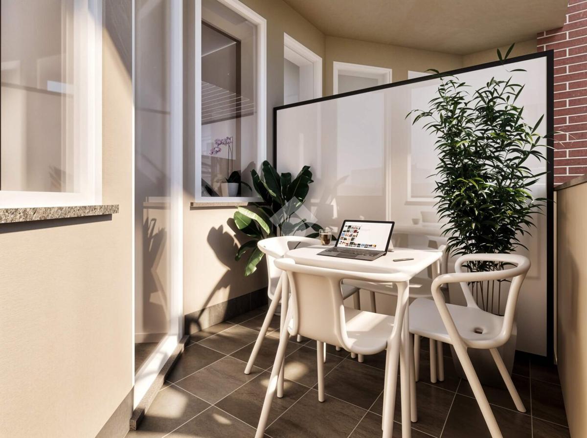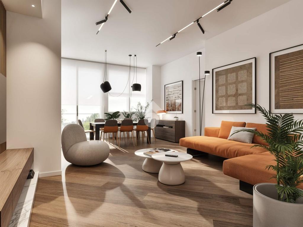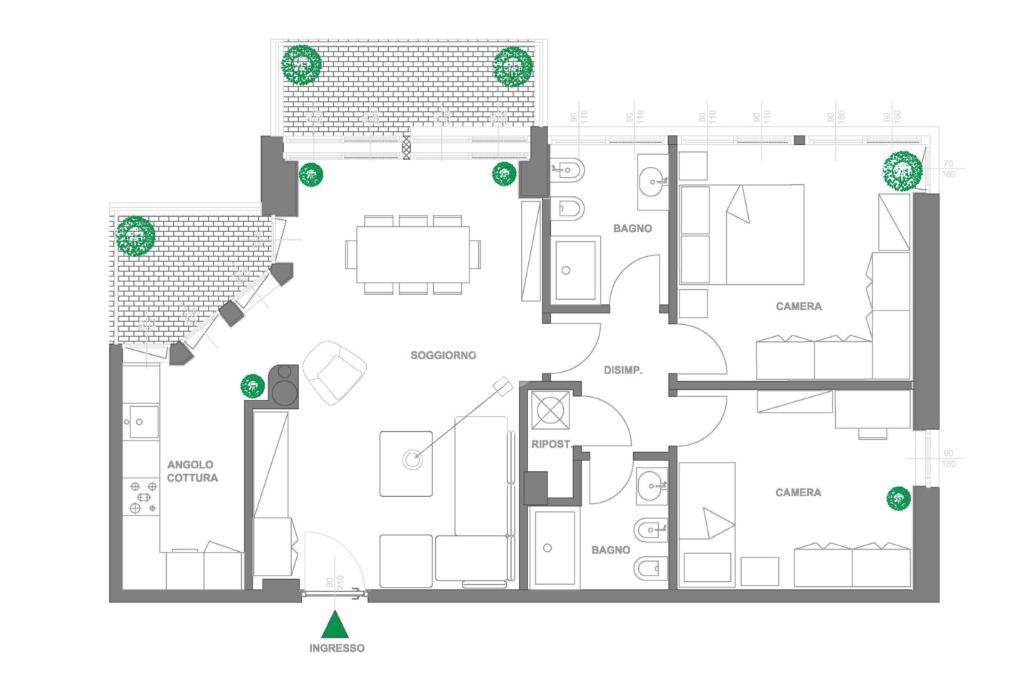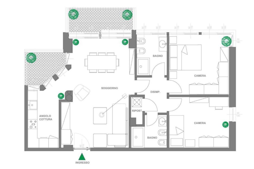 L’appartamento sarà dotato di ampia zona living con angolo cottura separato, due camere da letto, disimpegno, doppi servizi, comodo ripostiglio con attacco per la lavatrice e due balconi.