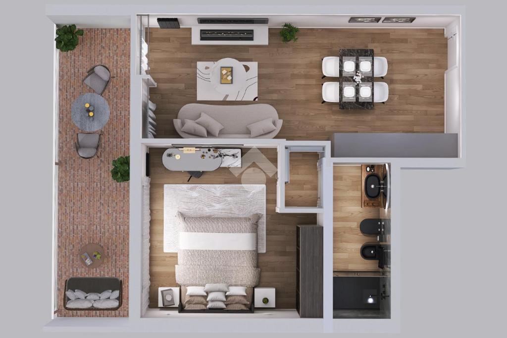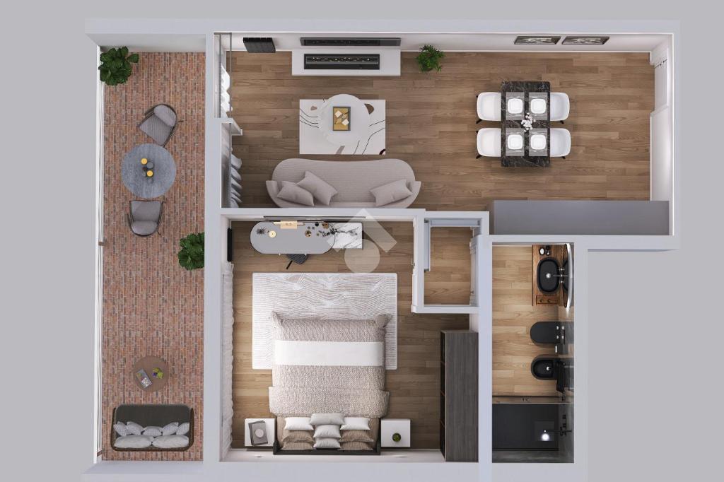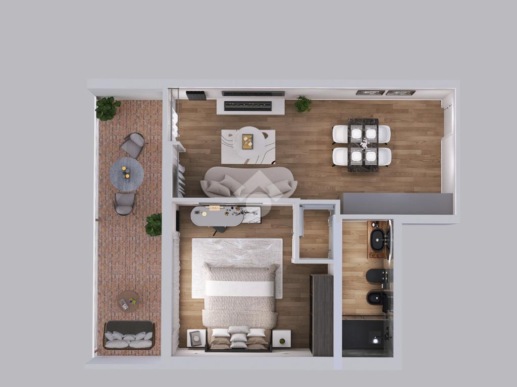 Ingresso su raffinata zona living con cucina a vista e soggiorno armoniosamente integrato, con affaccio diretto sull’ampio balcone/terrazzo, perfetto per allestire un’esclusiva area relax con tavolino e comodi arredi da esterno.